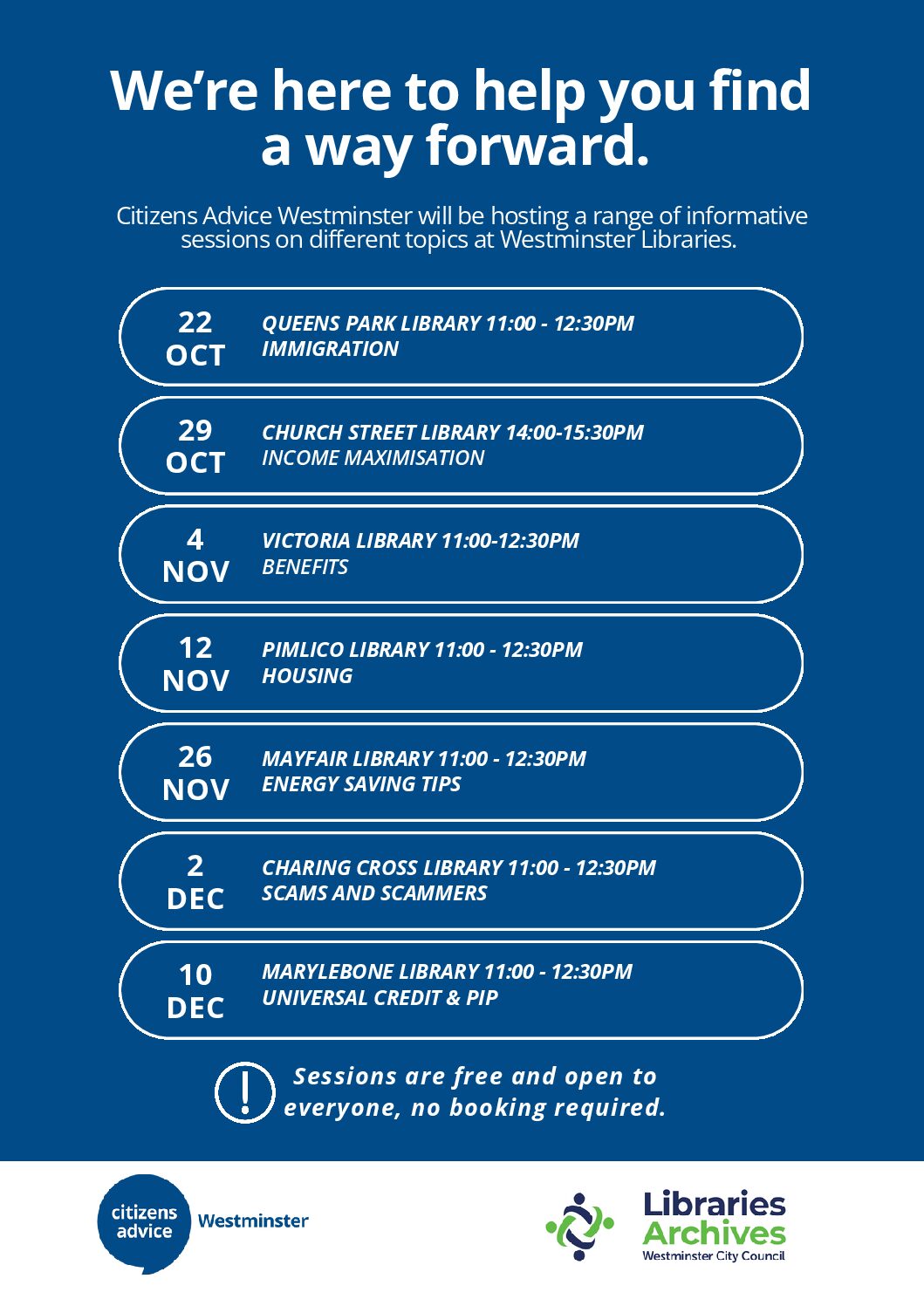 Citizens Advice Westminster will be hosting a range of informative sessions on different topics at Westminster Libraries.